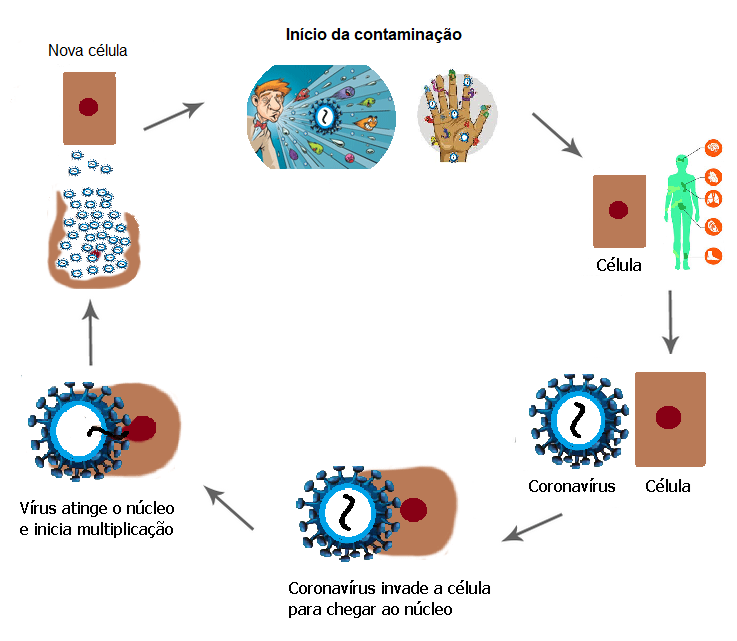 | Esses vírus novos vão procurar outras células e causar a infecção ou doença COVID-19. Com isso, o vírus aparece na saliva, na coriza ou nas mãos da nova pessoa e assim se propagando. |